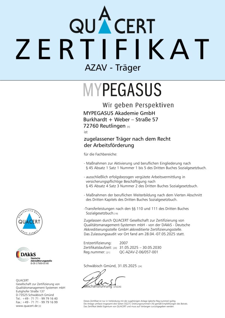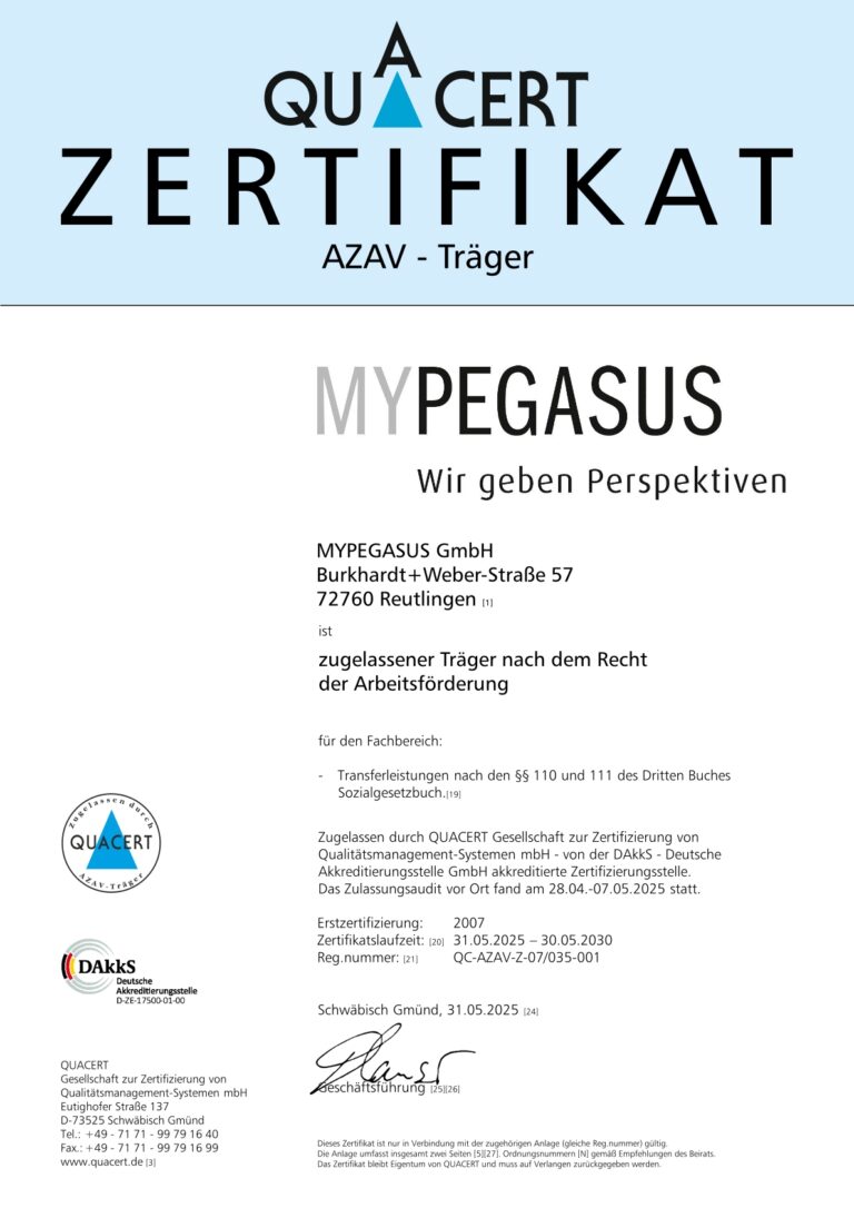 MYPEGASUS ist ein soziales Unternehmen. Menschen stehen bei uns im Mittelpunkt und wir pflegen einen respektvollen Umgang mit unserer Umwelt. Wir begleiten Menschen in allen Lebensphasen. Wir kennen die Nöte und Ängste entlassener Arbeitnehmer ebenso wie die Herausforderungen, denen sich Beschäftigte durch die immer schneller werdenden technischen und wirtschaftlichen Entwicklungen stellen müssen. Durch Beratung, Bildung, Vermittlung wollen wir Menschen gute Arbeit verschaffen und sie in guter Arbeit halten. Dabei steht die soziale Verpflichtung gegenüber den Menschen bei uns jederzeit im Einklang mit dem verantwortungsvollen und sparsamen Umgang finanzieller und natürlicher Ressourcen.