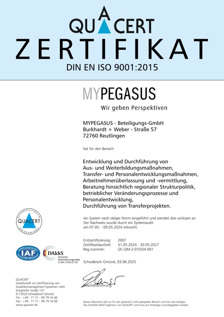 MYPEGASUS war und ist Trendsetter und sieht sich in der Verpflichtung, Arbeitsmarktinnovationen voranzutreiben. Wir erarbeiten neue Modelle für eine zukunftsfähige Arbeits- und Berufswelt. Unsere Organisation geht positiv mit veränderten Rahmenbedingungen um und ist in der Lage, Projekte kundenspezifisch umzusetzen. Wir sind Markt-, Qualitäts- und Innovationsführer in der Branche für Personaltransfer und überzeugen durch arbeitnehmerorientierte und innovative Problemlösungen. Zudem verpflichten wir uns, ein Energiemanagement nach DIN ISO EN 16247-1 umzusetzen. Dies stellt sicher, dass unser Energieverbrauch langfristig sinkt, sowie unsere Energieeffizienz und unsere energiebezogenen Leistungen in einem ständigen Verbesserungsprozess gesteigert wird.